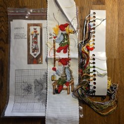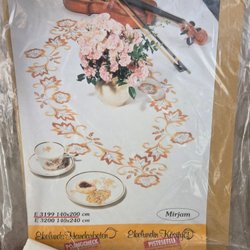Broderikit till en löpare med motiv av blommor. Storlek ca 20*48 cm. Tyvärr finns ingen färgbild på hur den ser ut som färdigsydd. Men går att titta på bild nr 2 och göra sig en uppskattning hur det blir. Komplett med nål, tråd, väv och mönster. Oanvänd.