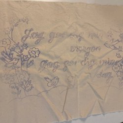 Ett broderi med texten: "En natt jag drömde något som jag aldrig drömt förut. Jag drömde det var fred på jord och alla krig var slut". Motivet har även två duvor och blommor.
