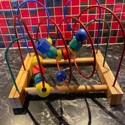 Färgglad kulram i trä med olika fordon och former. Perfekt för barn att utveckla sin motorik och koordination.