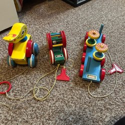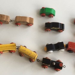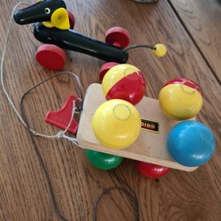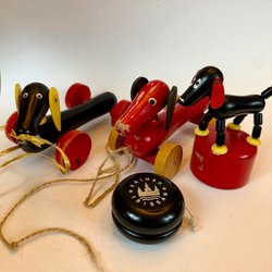 Klassiska BRIO leksaker i trä. Inkluderar en BRIO bänk och en BRIO draghund.