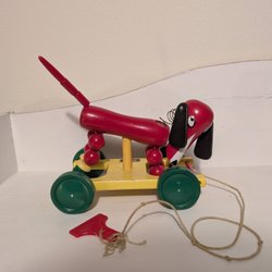 Klassisk BRIO trähund. En leksak från BRIO, tillverkad i Sverige. Hunden är gjord av trä och har flera rörliga delar.
