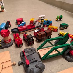 Ett BRIO tågbana set med diverse delar. Inkluderar räls, tåg, vagnar och tillbehör. 2 av loken är eldrivna. Vikt 3 kg.