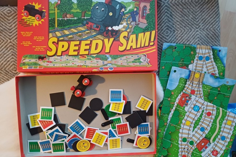 Ett BRIO spel, Speedy Sam. Spelet går ut på att spela, vara klurig och lära sig om färger och antal.