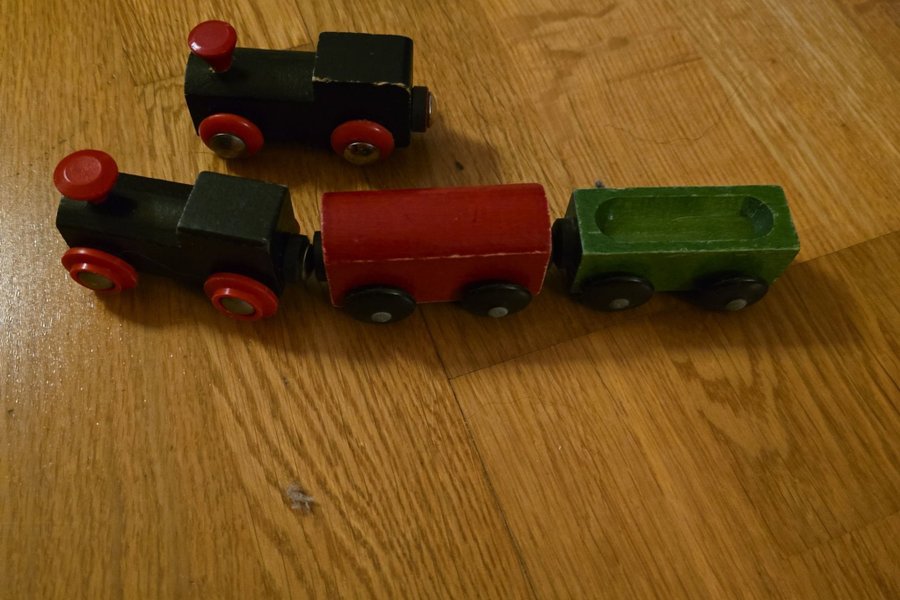 Ett trätåg med två lok och två vagnar. Vagnarna är i färgerna rött och grönt. Loken är svarta med röda hjul.