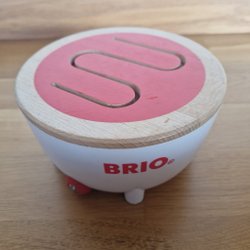 BRIO labyrintspel i rött med trähandtag. Spelet går ut på att styra en metallkula genom en labyrint genom att luta spelplanen. Kulan kan gå över från framsida till baksida. Gott lekt skick. Vissa små repor.