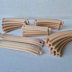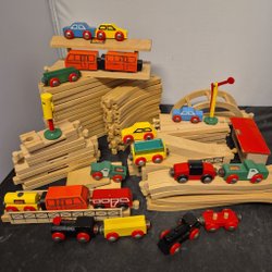 Massa olika delar och tågvagnar till en tågbana. Finns nog både brio och ikea delar men de går ihop. Väger flera kilo. Exakt vet jag inte. Skickas i låda/kartong. Så obs, plastbacken ingår inte.