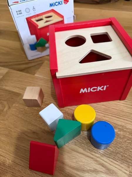 Micki formsorterare i trä med klossar i olika färger och former. Lådan är röd med en träfärgad toppskiva med utskurna hål för formerna. Klossarna är en röd kvadrat, en grön triangel, en vit rektangel, en gul cylinder, en blå cylinder och en träfärgad kub.