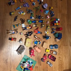 En samling av diverse leksaker. Inkluderar hus, fordon, verktyg, djurfigurer och en leksakskassaapparat.