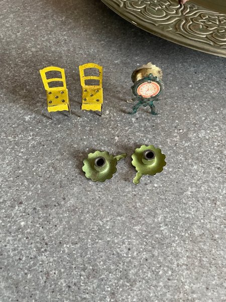 Ett set med diverse möbler för ett dockskåp. Inkluderar stolar, ljusstakar och en klocka.