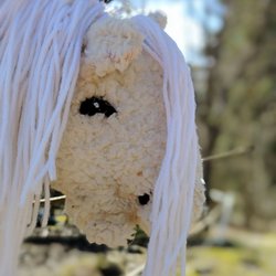Köpt käpphäst från butik, men det har limmats på en vit bläs för att den skulle likna dotterns riktiga häst. Tyvärr har den bläsen lossnat och kvar sitter limmet i ansiktet. Vi har inte försökt att få bort det. Förutom limfläckarna är käpphästen i fint skick.