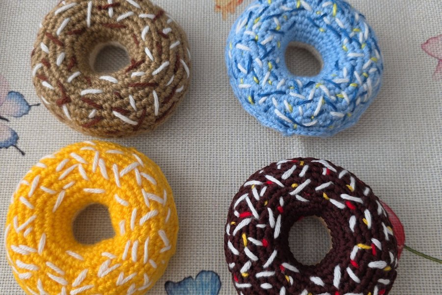 Set med 4 virkade munkar i olika färger. Perfekta som leksaksmat eller dekoration. Munkarna är virkade med detaljerade strössel i vitt, brunt, gult och rött.