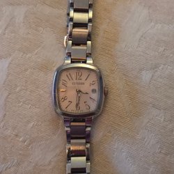 En klassisk Citizen damklocka med analogt urverk. Klockan har en grå blå metallic urtavla med datumvisning. Boetten är tillverkad av rostfritt stål och armbandet är av läder.