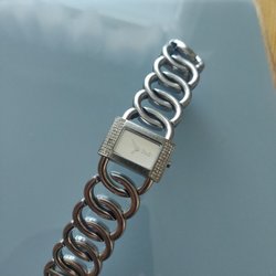 Säljer en elegant damklocka. Klockan har en silverfärgad urtavla med romerska siffror och är dekorerad med strass runt boetten och på armbandet. Klockan drivs av ett quartz urverk.