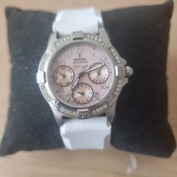 En stilren Kesto Quartz klocka med ett silverfärgat elastiskt armband. Urtavlan är vit med tydliga siffror. Perfekt för den som söker en enkel och funktionell klocka.