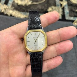 Klassisk Certina armbandsur med quartz urverk. Klockan har en guldfärgad boett och en vit urtavla med svarta siffror och visare. Datumvisning finns vid klockan 3. Armbandet är tillverkat av svart läder. Swiss made.fungerar som det ska nytt batteri