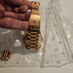 Säljer en Michael Kors damklocka med en guldfärgad boett och armband. Klockan har en orange urtavla med guldfärgade markeringar och visare. Datumvisning finns också. Perfekt för den som söker en stilren och elegant klocka. Behövs nytt batteri. Köpt i USA. Saknar kvitto