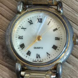 Säljer en quartz damklocka med ett silverfärgat armband. Klockan har en rektangulär urtavla med texten "Quartz".