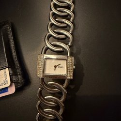 Elegant D&G dameur med sølvfarvet urkasse og matchende armlænke. Uret har en rektangulær urskive med time markeringer ved 12, 3 og 9. Quartz urværk. Det er brugt få gange, men skal have nyt batteri. Æsken er desværre gået i stykker og følger derfor ikke med.