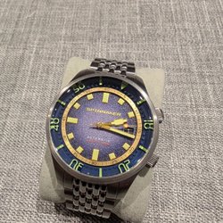 Bulova "Curved" herrklocka med stålarmband. Klockan har en blå urtavla med tre mindre urtavlor och en röd sekundvisare. Baksidan av klockan är märkt med "Bulova, Ultra High Frequency, Sapphire Glass, Water Resistant, B6 ST Steel".