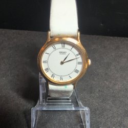 Elegant Seiko damklocka med kvartsverk. Klockan har ett guldpläterat boett och ett matchande guldpläterat armband med en flexibel design. Urtavlan är ljus med tydliga markeringar. Klockan är i gott skick med tanke på åldern.