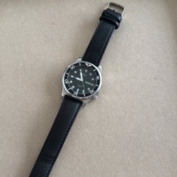 Bucherer Quartz herrklocka med ett svart läderarmband. Klockan har en svart urtavla och datumvisning. Boetten är i rostfritt stål.
