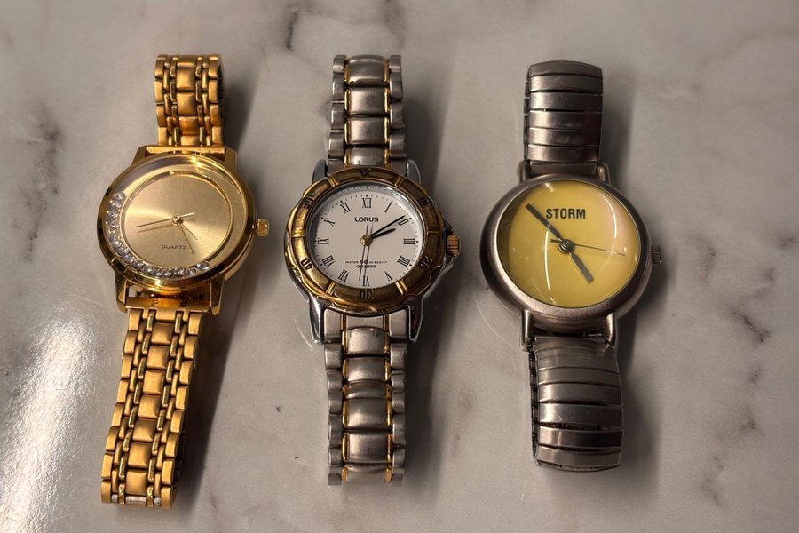 Damklockor 1 Lorus, 1 storm, 1 okänt märke. Alla behöver batteribyte, vet ej funktion på någon av dem.