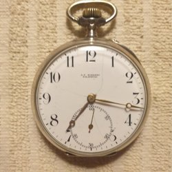 Antikt fickur med vit urtavla och romerska siffror. Urtavlan är märkt med 'ANTIMAGNETIC'. Baksidan av boetten är dekorerad med ett mönster.