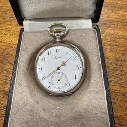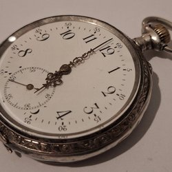 Ett fickur i silver. Uret har en vit urtavla med svarta siffror och en liten sekundvisare. Boetten är stämplad 0.800. Mekanisk urverk.