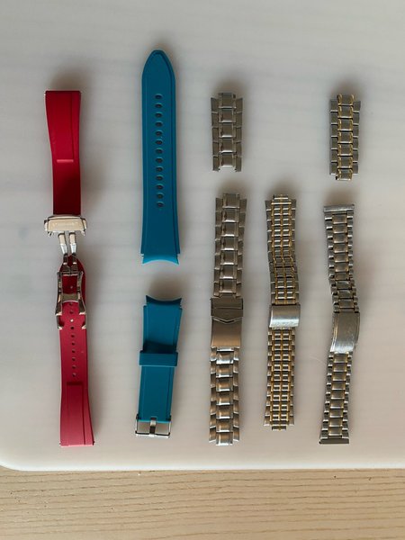 Ett sortiment av olika klockarmband i varierande material och stilar. Inkluderar både gummi- och metallarmband. Perfekt för att byta ut eller anpassa din klocka. Samtliga band har en bredd på 20mm.