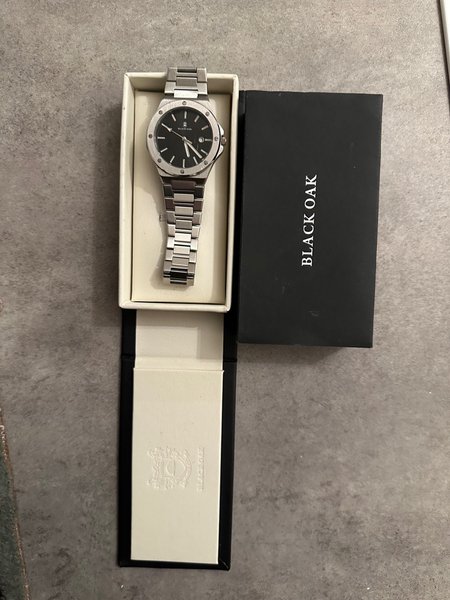 Snygg herrklocka från Black Oak med boett och armband i stål. Urtavlan är svart med datumvisning. Klockan har ett quartzurverk.