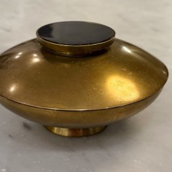 Liten bordsklocka infattad i mässingshållare.