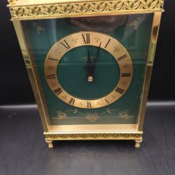 En elegant Junghans Ato-Mat bordsklocka med en guldfärgad ram. Klockan har en klassisk design med tydliga siffror och en dekorativ detaljering. Drivs med batteri.