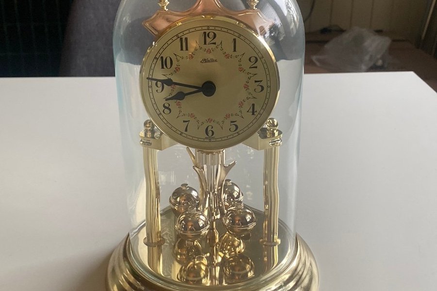 En elegant bordsklocka med en vacker glaskupa. Klockan har en klassisk design med en guldfärgad bas och detaljer. Perfekt som en dekorativ inredningsdetalj i hemmet.