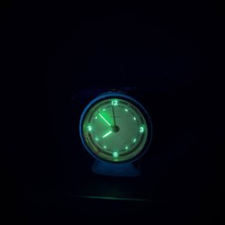 Väckarklocka med mekaniskt urverk. Baksidan har rattar för att ställa in tid och alarm, samt en uppdragningsmekanism. Klockan är märkt med ”701” på baksidan. Glaset är sprucket.