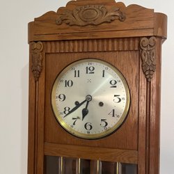 En vacker väggklocka med trädetaljer. Perfekt för att ge en touch av vintage till ditt hem.Herrgårdklocka GB tyskur funkar ca 120 år gammal.