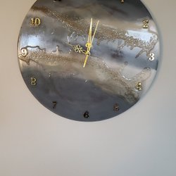 Unik och dekorativ väggklocka, handgjord i resin med stilren trä/guld/vit design.