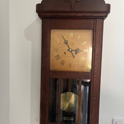 Väggklocka i trä med pendel. Klockan har ett ljust urtavla med tydliga siffror och visare. Framsidan har ett glasfönster som visar pendeln. Klockan är tillverkad av trä med snidade detaljer.