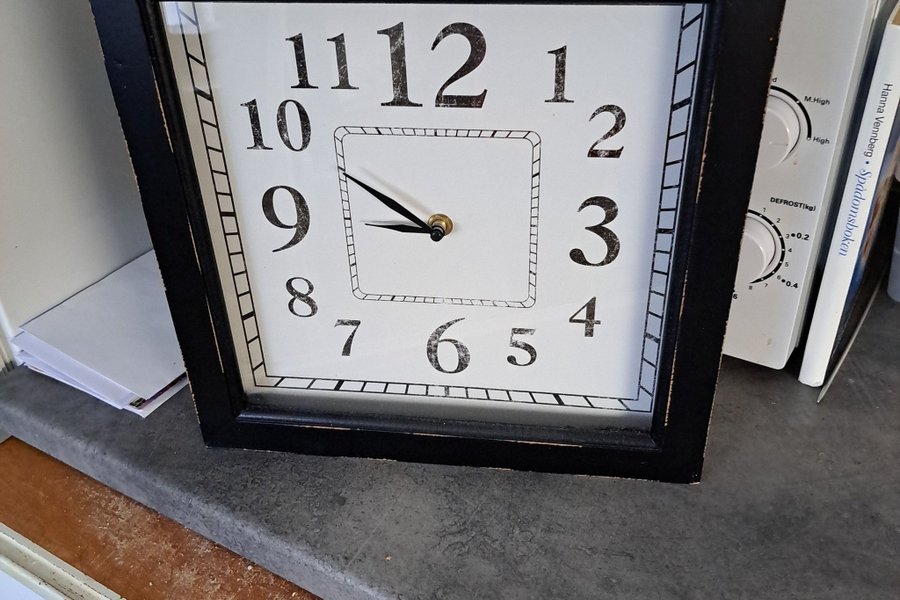 Väggklocka med svart ram och vit urtavla. Siffrorna är stora och tydliga i en mörk färg. Klockan har svarta visare för timmar och minuter. Ramen har en sliten look som ger den karaktär.