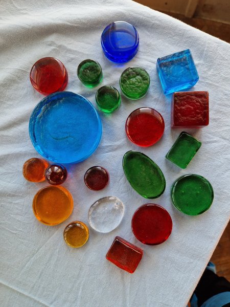 Fina glasbitar i olika färger och former. Högst troligt svenskt glas men de är omärkta.