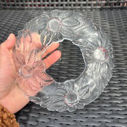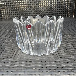 En glasskål med ett mönster av romber och en vågig kant.