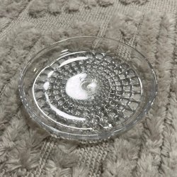 En glasskål med en unik design som liknar en stjärna eller blomma. Skålen är tillverkad av klart glas och har flera utskjutande "armar" som ger den ett dekorativt utseende. Den kan användas som en fruktskål, godisskål eller som en prydnad.