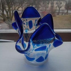 Dekorativ skål i glas med blå och gröna dekorationer.