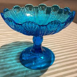 En glasskål i klart pressglas. Skålen har ett mönster på sidorna och en vågig kant upptill. Botten är dekorerad med ett mönster av bubblor och linjer.
