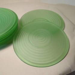 Glasskål i rökfärgat glas. Skålen har ett mönster av cirklar med horisontella linjer. Repor i botten.