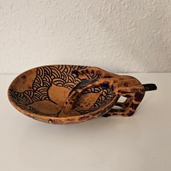 Denne lilla glasvase har et mønster og en bølget kant foroven. Den er velegnet til blomster eller som en dekorativ genstand i hjemmet.