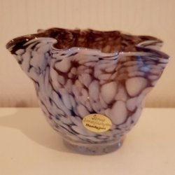 En rosa vas med vita prickar och en mörkare lila/grå krusad kant upptill. Höjd 14 cm. Som ny!