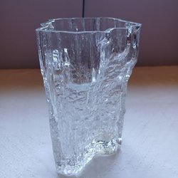 Denna vas är en antik eller vintage samlarobjekt i glas, ofta kallad för en "fingervas" eller "kaktusvas" på grund av sin unika form som liknar utstickande blad eller fingrar.