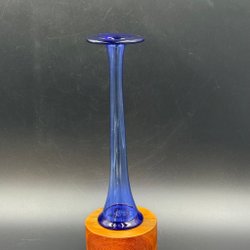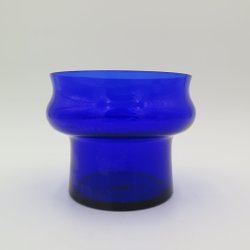 Vas i glas med runda former och blå detaljer. Vasen är 17 cm hög och har en diameter på 22 cm.