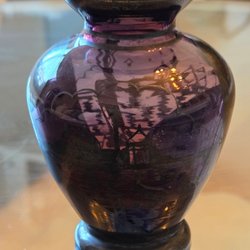 Vasen är ett föremål i djuplila glas. Den har en distinkt dubbelpumpa-form. Signerad.