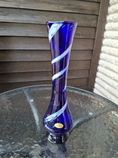 En blå vas med vit spiraldekor. Vasen har en etikett där det står "Echt Handarbeit". 28 cm